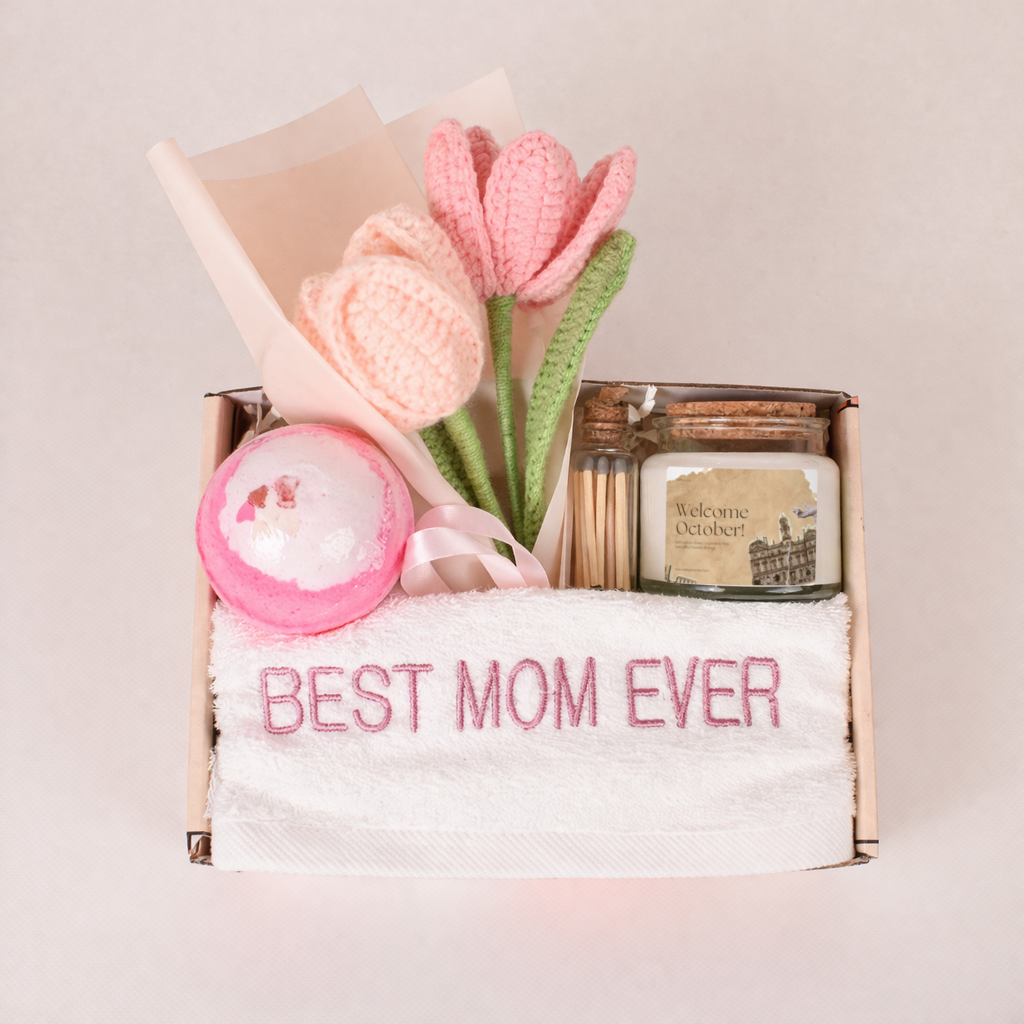 - Complete Gift Set – Includes a candle, bath bomb, crochet flower bouquet, jar of matches, and a “Best Mom Ever” towel