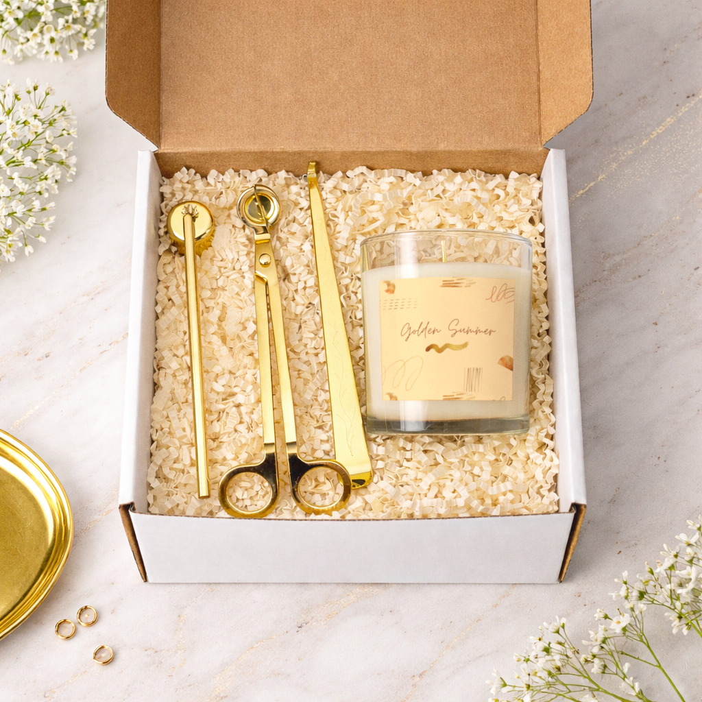 Product Overview: The Golden Glow Candle Care Gift Set includes 1 x 11oz Clear scented candle, 1 Wick Trimmer, 1 Snuffer, and 1 Wick Dipper — a complete set designed for the ultimate candle care experience. The soy candle offers a clean, consistent burn, while the included tools help extend its life and enhance the burning ritual. Whether you're gifting or indulging in a bit of self-care, this elegant set blends function with style. Customize the candle label with your own design for a personal touch or branded presentation. A perfect gift for candle lovers, special occasions, or premium client gifting.