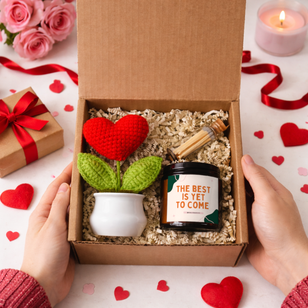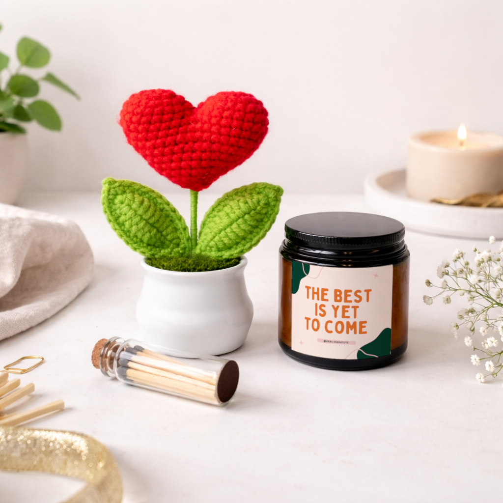 Product Overview: Celebrate love with a beautifully curated Sweet Heart Bloom Gift Set gift set designed to create cozy moments and lasting smiles. This romantic trio features a 4oz amber soy candle to set the mood, a handcrafted crocheted heart succulent as a sweet keepsake, and a stylish jar of matches to complete the experience. Perfect for Valentine’s Day, anniversaries, or simply surprising someone special, this gift set blends warmth, charm, and thoughtful details—making it a meaningful way to show how much you care.