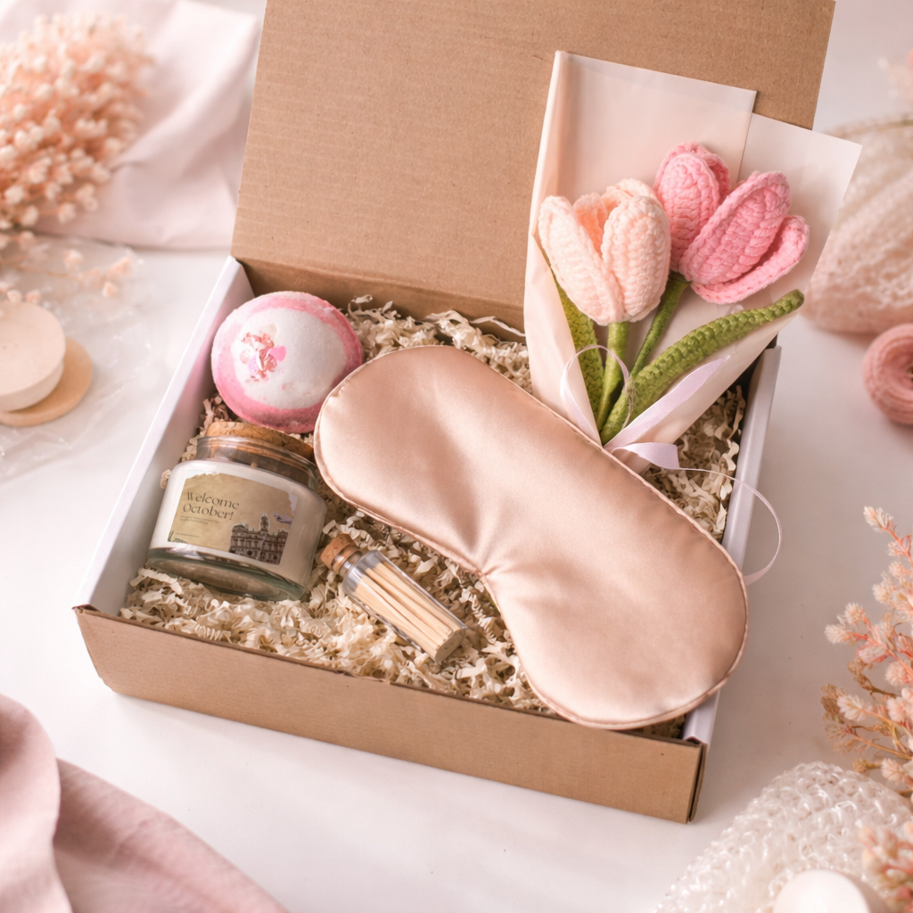 Product Overview: The Blush Calm Gift Set is thoughtfully curated to promote relaxation, comfort, and mindful self-care. Featuring a soothing White Sage + Lavender soy candle, a spa-inspired bath bomb, a soft satin sleep mask, a charming handmade crochet flower bouquet, and a matching jar of matches, this set transforms everyday routines into peaceful rituals. Elegant, calming, and ready to gift, it’s perfect for anyone who deserves a moment of rest, warmth, and appreciation.